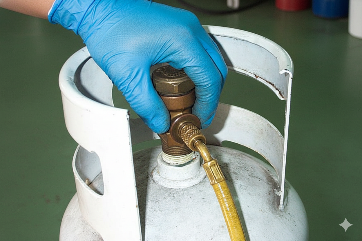 - เปิดวาล์วกระป๋องหรือถังให้สารทำความเย็นเริ่มไหล