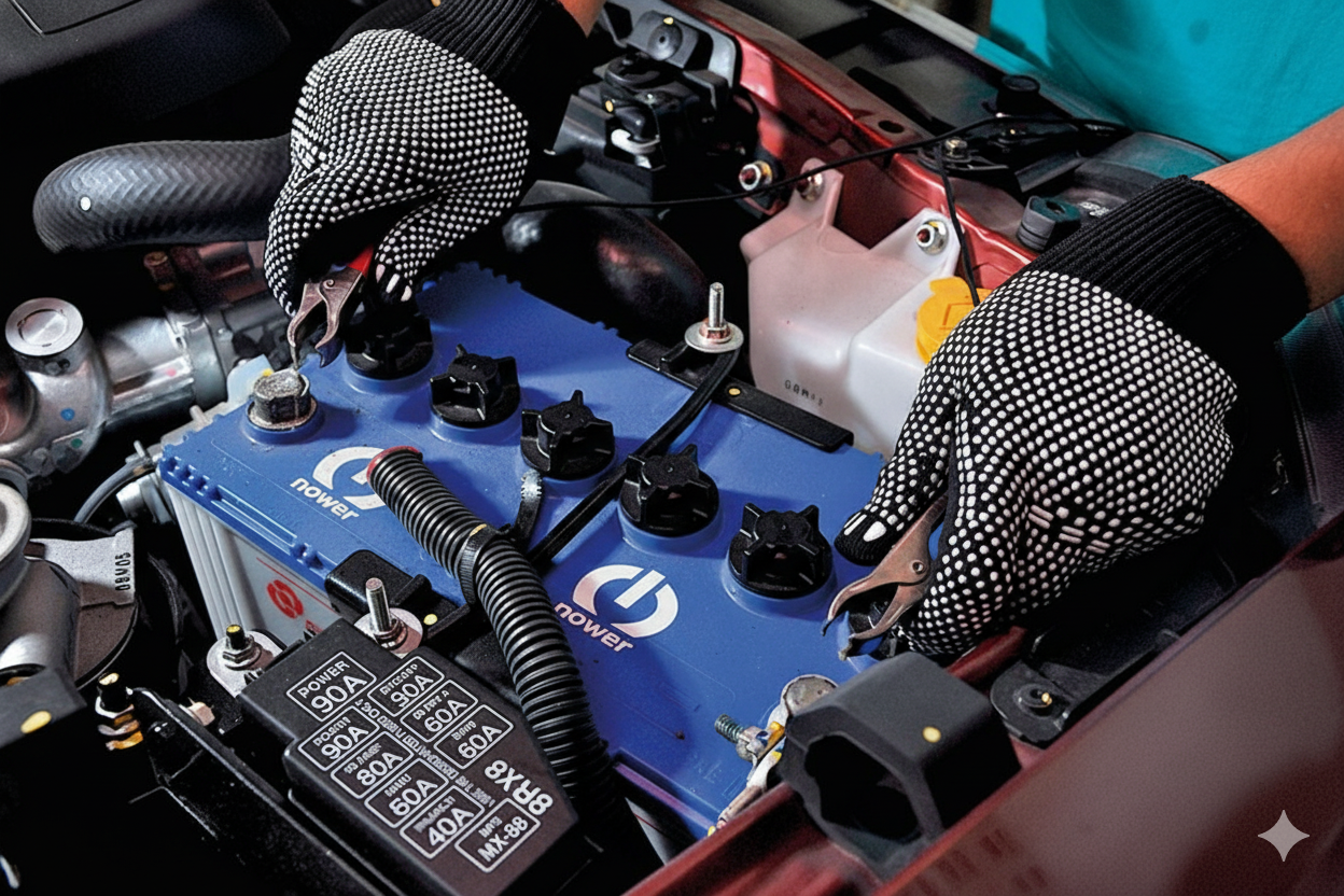 1. ต่อไฟส่องสว่าง โดยนำขั้วบวก (สีแดง) และขั้วลบ (สีดำ) ไปหนีบที่ขั้วแบตเตอรี่