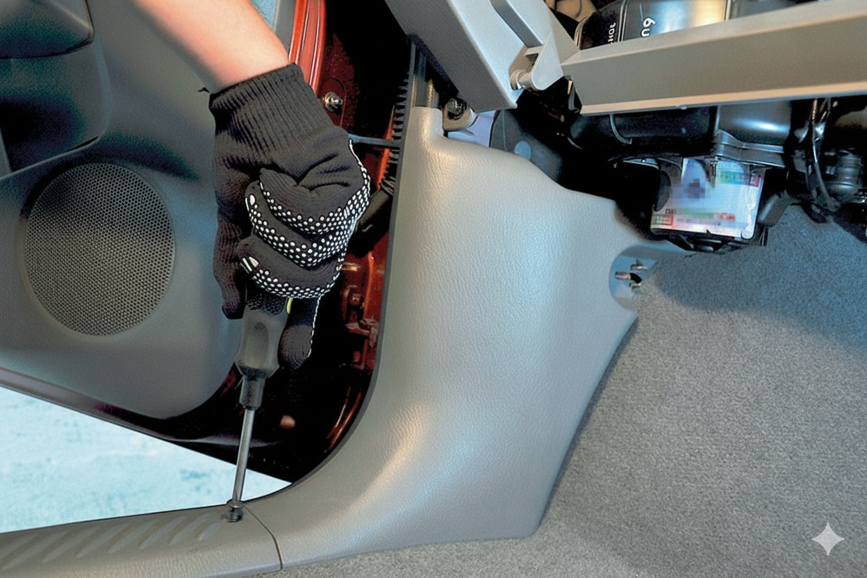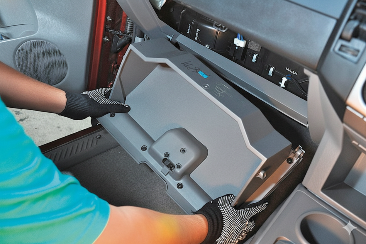 2. ถอดลิ้นชักหน้ารถ โดยบิดตัวล็อกออกทีละข้างอย่างระมัดระวัง