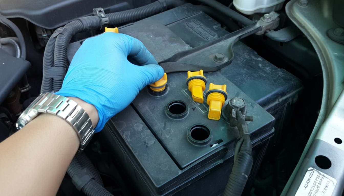 - แบตเตอรี่ที่เติมน้ำกลั่น: ควรตรวจสอบระดับน้ำกลั่นว่าอยู่ในระดับสูงสุดหรือไม่ ถ้าต่ำกว่าควรเติมน้ำกลั่นเพื่อป้องกันไม่ให้แบตเตอรี่ทำงานไม่เต็มประสิทธิภาพ