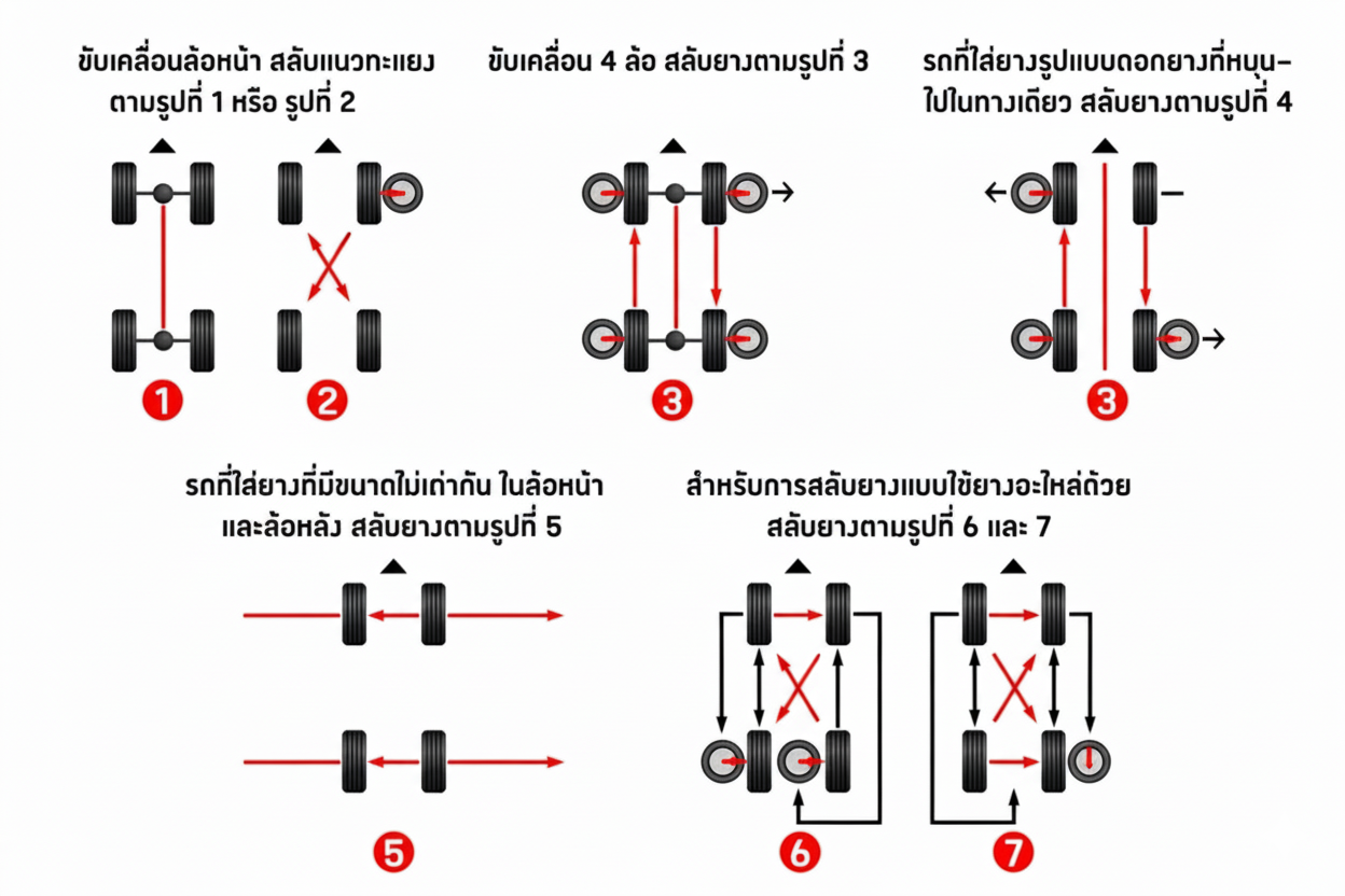 การสลับยางทุก 10,000 กิโลเมตร หรือทุกครั้งที่เปลี่ยนถ่ายน้ำมันเครื่อง จะช่วยให้การสึกหรอของยางเกิดขึ้นอย่างเท่าเทียมกันในทุกเส้น ซึ่งจะช่วยยืดอายุการใช้งานของยางและเพิ่มความปลอดภัยในการขับขี่