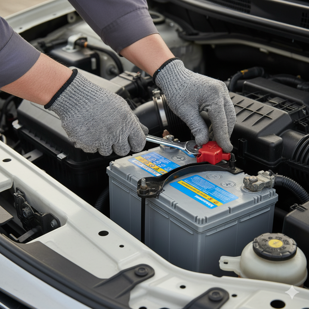 ควรสวมถุงมือผ้าและแว่นตาป้องกันเพื่อป้องกันการสัมผัสกับสารเคมีหรือการเกิดประกายไฟในระหว่างการถอดขั้วแบตเตอรี่