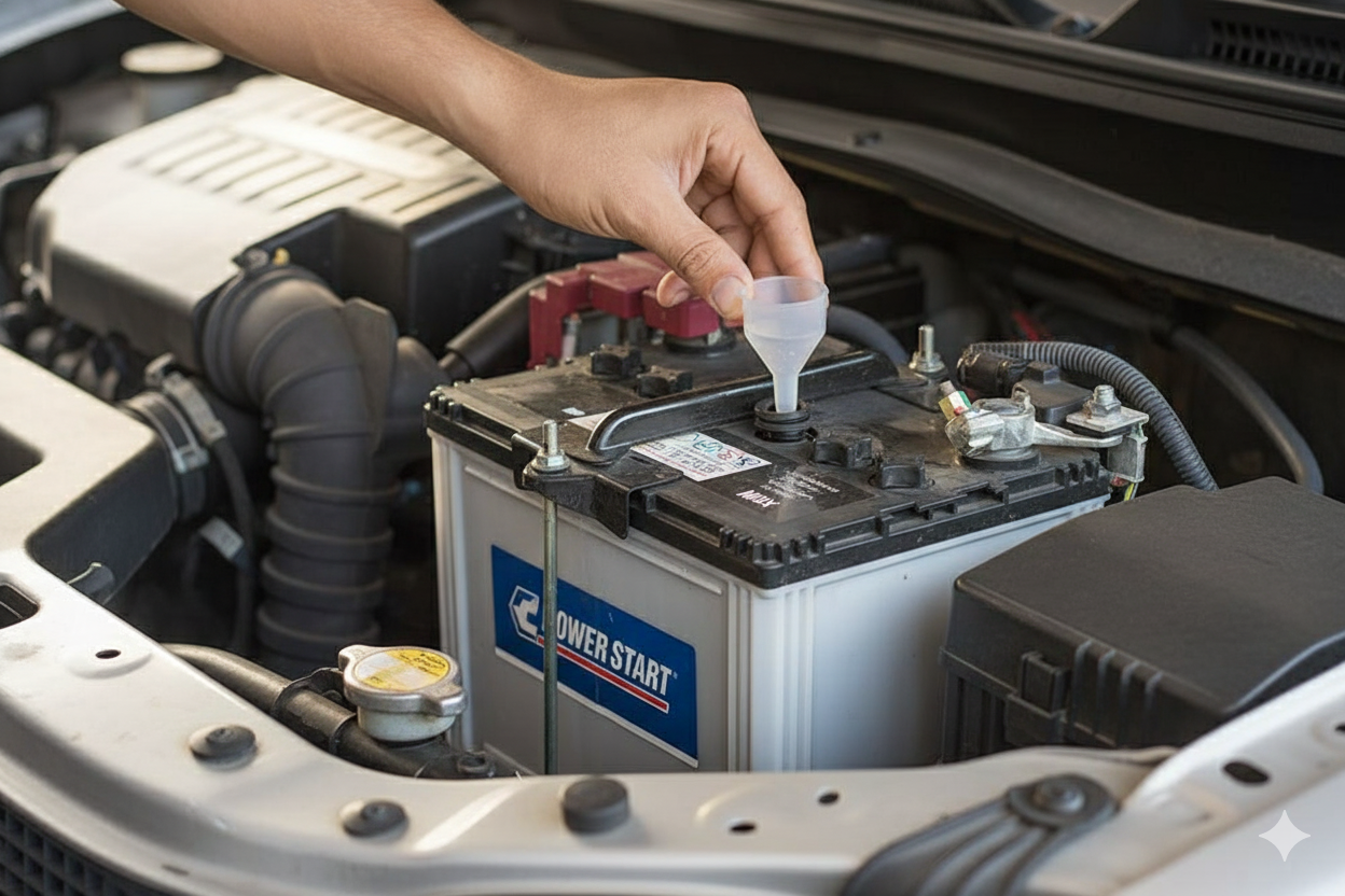 สำหรับแบตเตอรี่ที่ต้องเติมน้ำกลั่น ควรเช็กระดับน้ำกลั่นอย่างสม่ำเสมอเพื่อป้องกันไม่ให้แบตเตอรี่เสียหาย.